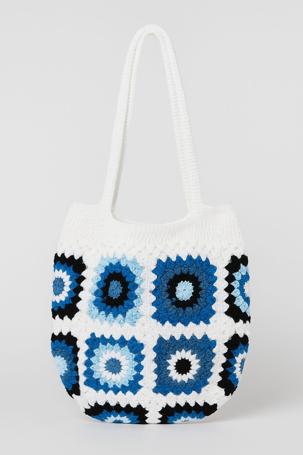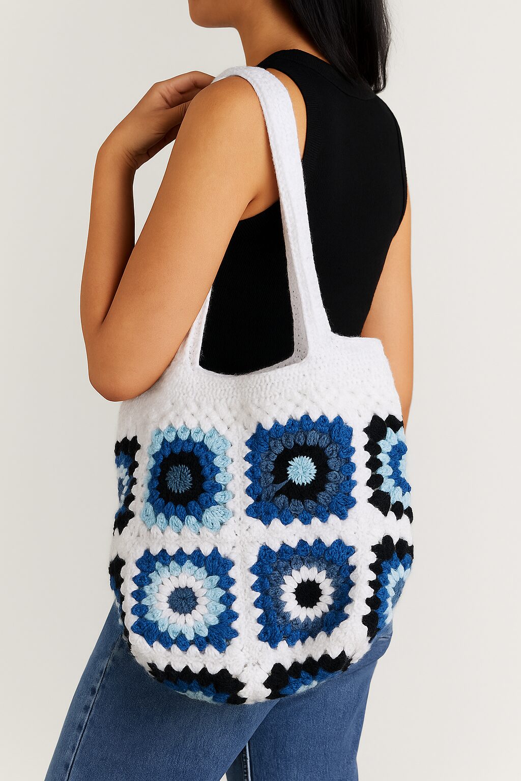 Hand‑crocheted cotton tote featuring blue evil‑eye inspired granny squares, roomy bucket silhouette, and soft shoulder straps for comfortable all‑day carry.