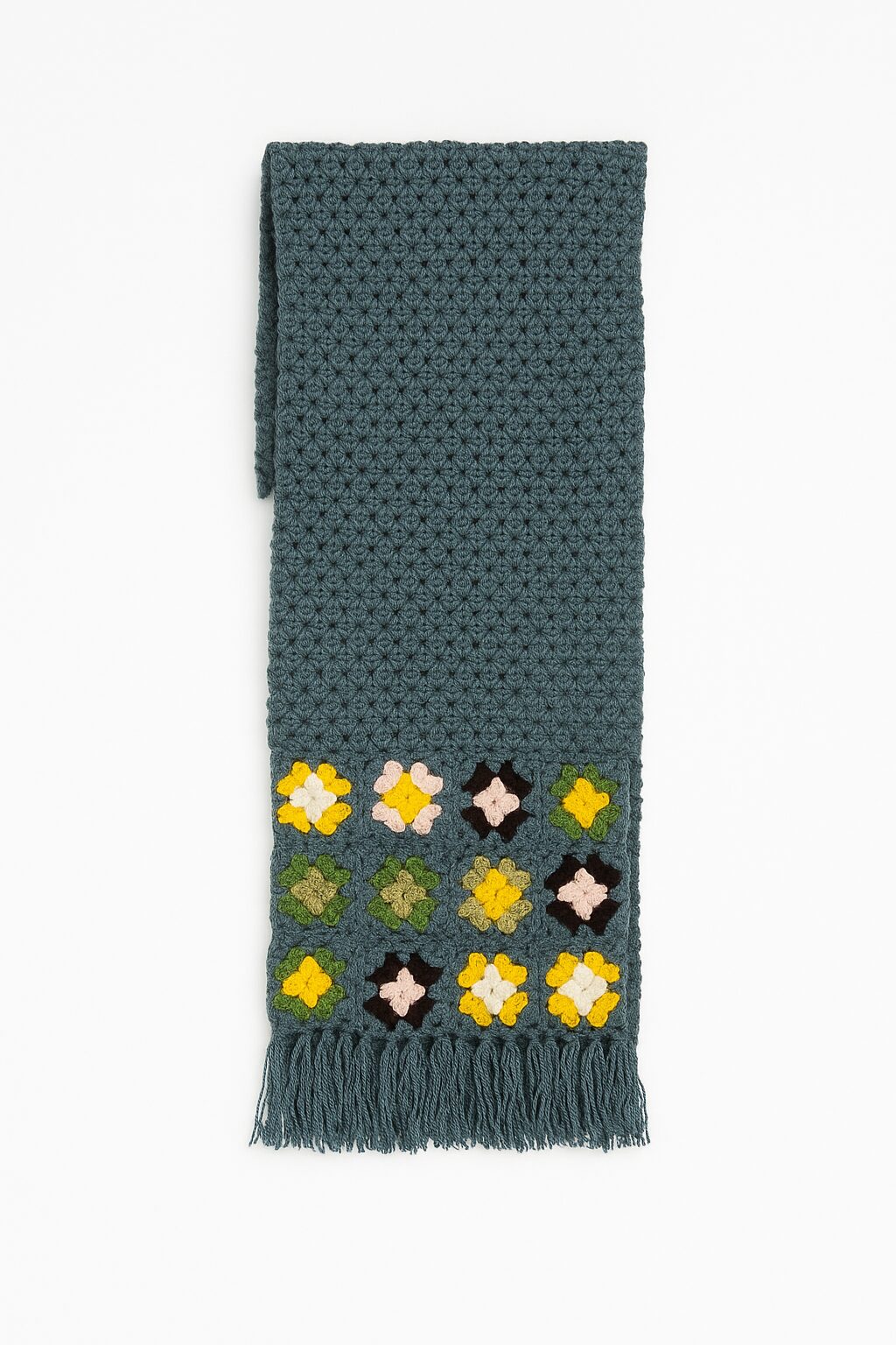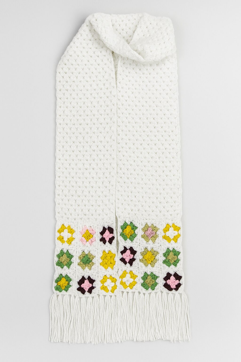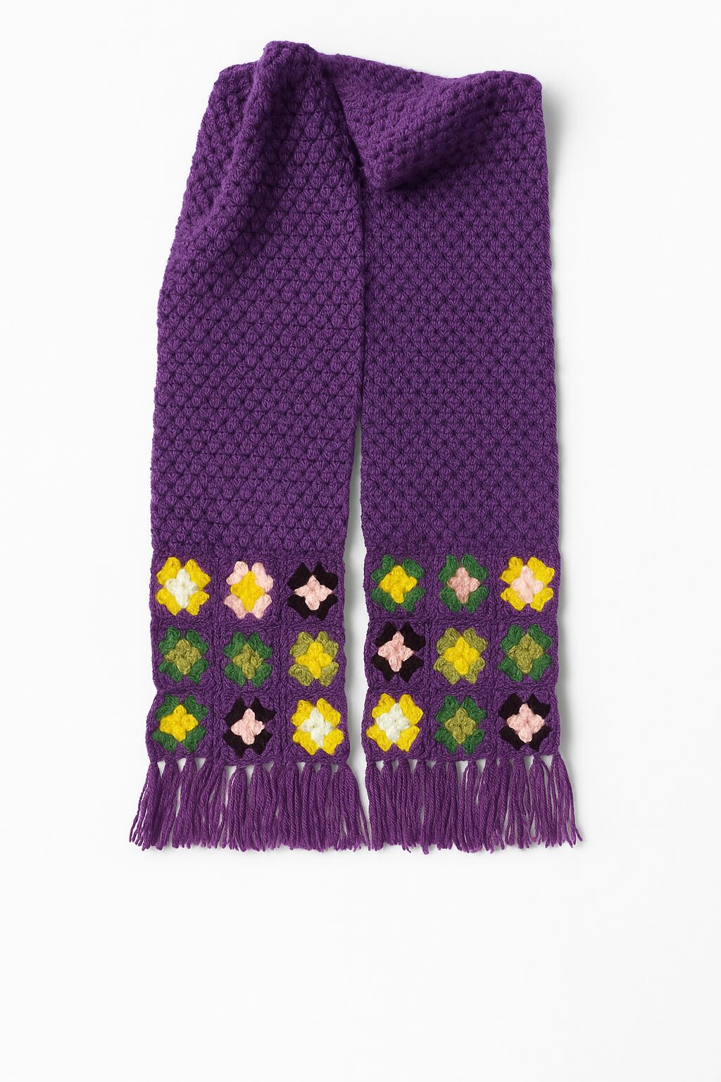 Hand‑crocheted acrylic wool muffler featuring colorful granny‑square borders and soft fringes; lightweight, warm, and easy‑care for everyday winter styling.