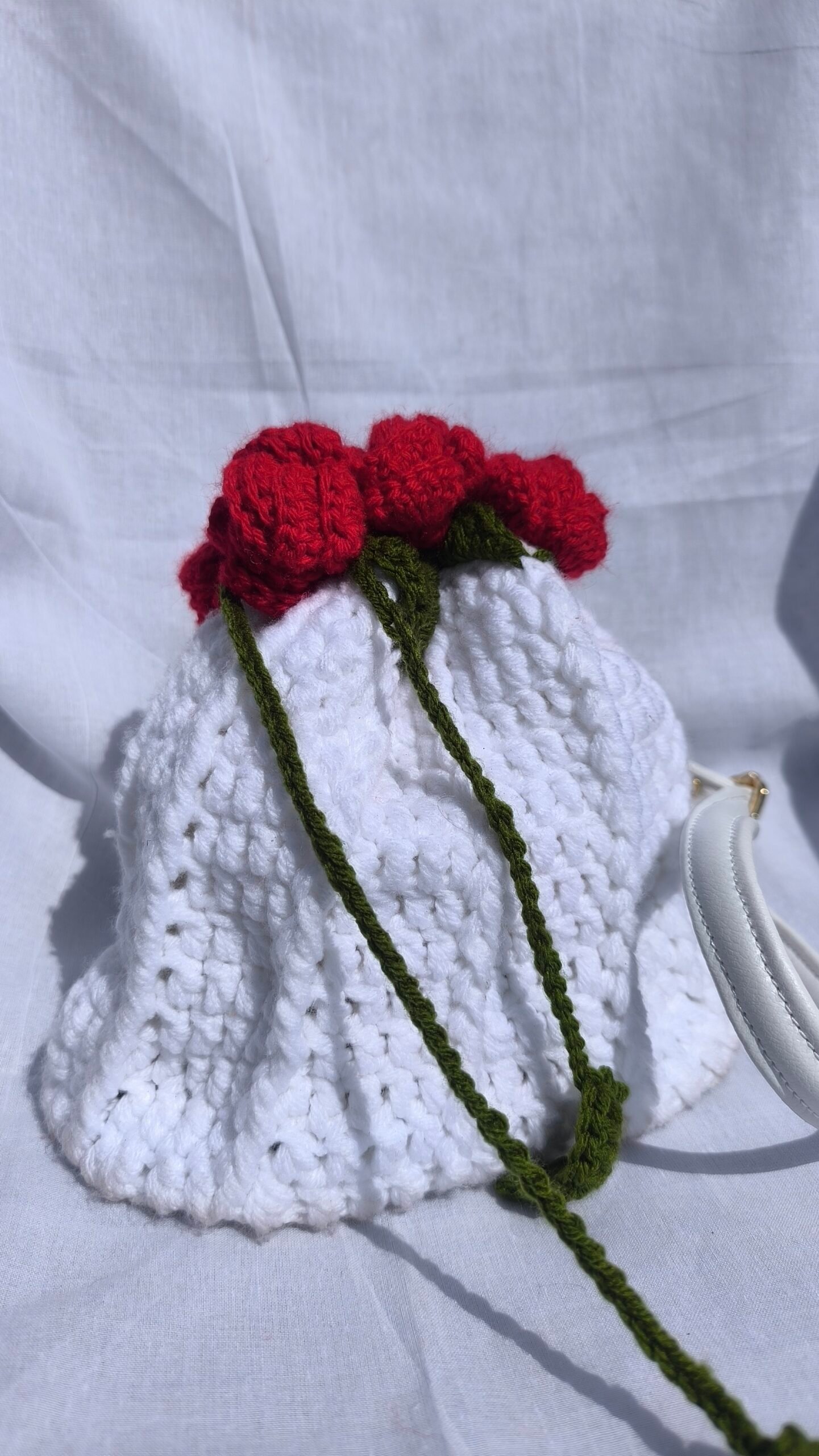 A beautiful handmade crochet bag made with acrylic yarn, featuring a soft white body and six red crochet roses on top with green drawstring stems. Stylish, floral, and perfect for carrying small essentials with a unique handmade charm. πΉπβ¨
