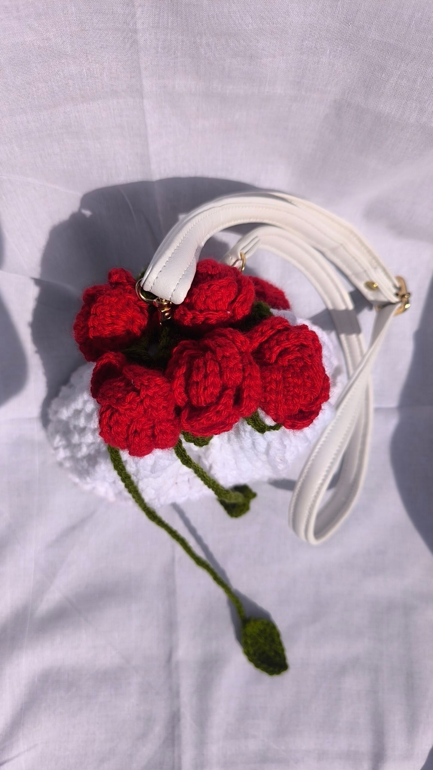 This beautiful handmade crochet bag is crafted using high-quality acrylic yarn, giving it a soft, durable, and well-structured texture. The base of the bag is made with thick white crochet stitches that create a cozy knitted pattern and an elegant look. The highlight of the bag is the six vibrant red crochet roses beautifully placed on the top, adding a charming floral design that instantly catches attention. Green crochet cords act as drawstrings and resemble delicate flower stems with a leaf at the end, enhancing the natural rose-inspired theme.