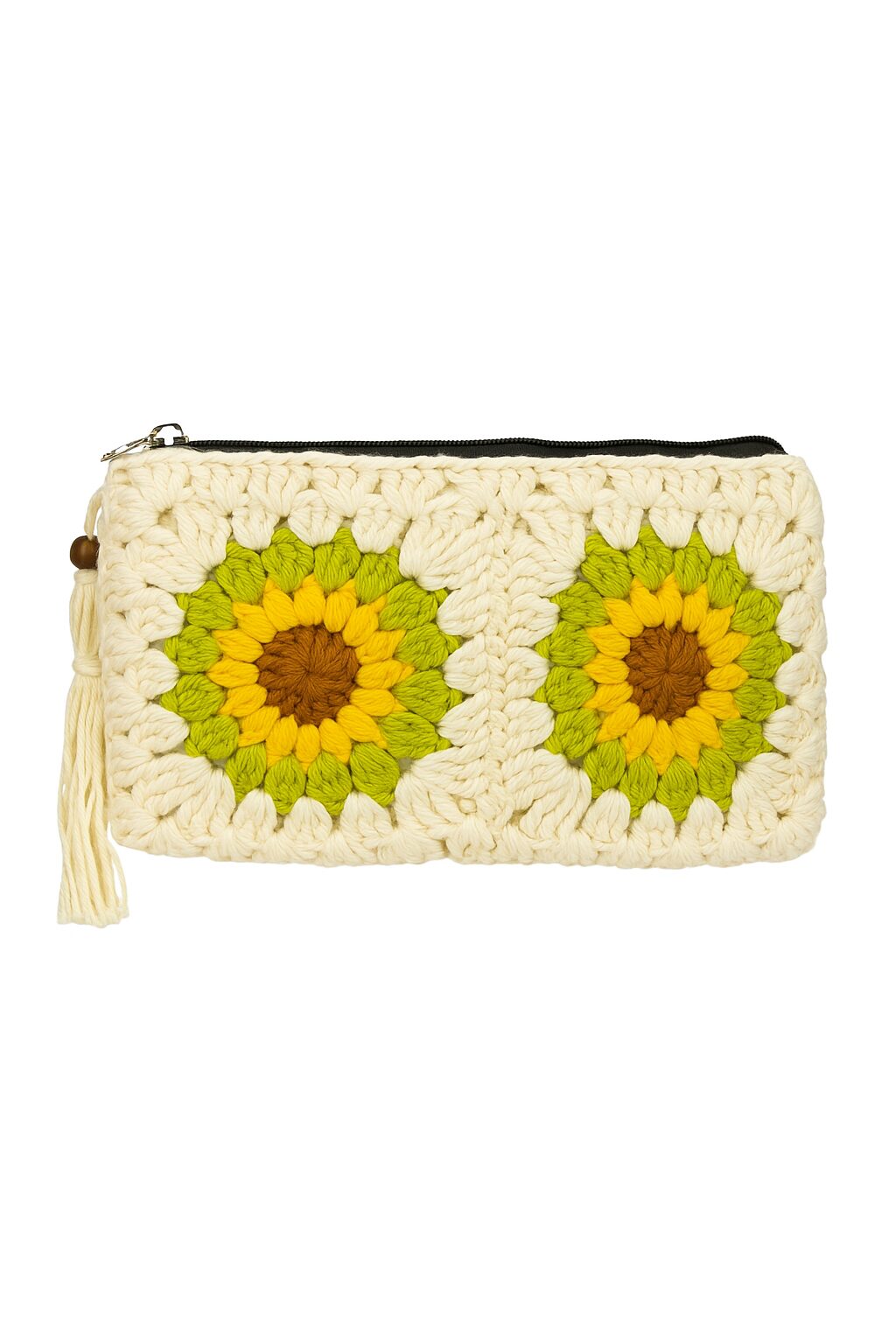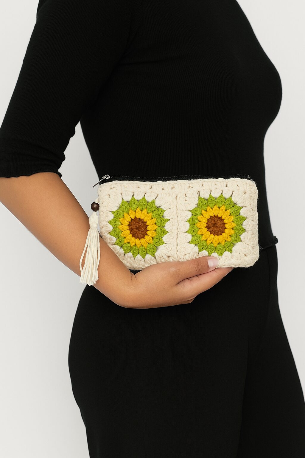 Made from durable cotton yarn, this palm‑friendly wallet features two sunburst motifs in fresh yellow‑green tones framed by an ivory base for a cheerful, artisanal look. The smooth zip closure keeps cash, coins, cards, and earbuds safely inside, while a side tassel adds easy grip and a playful finish. Lightweight yet sturdy, it fits small handbags and pockets, and slight handmade variations make each piece uniquely one of a kind.